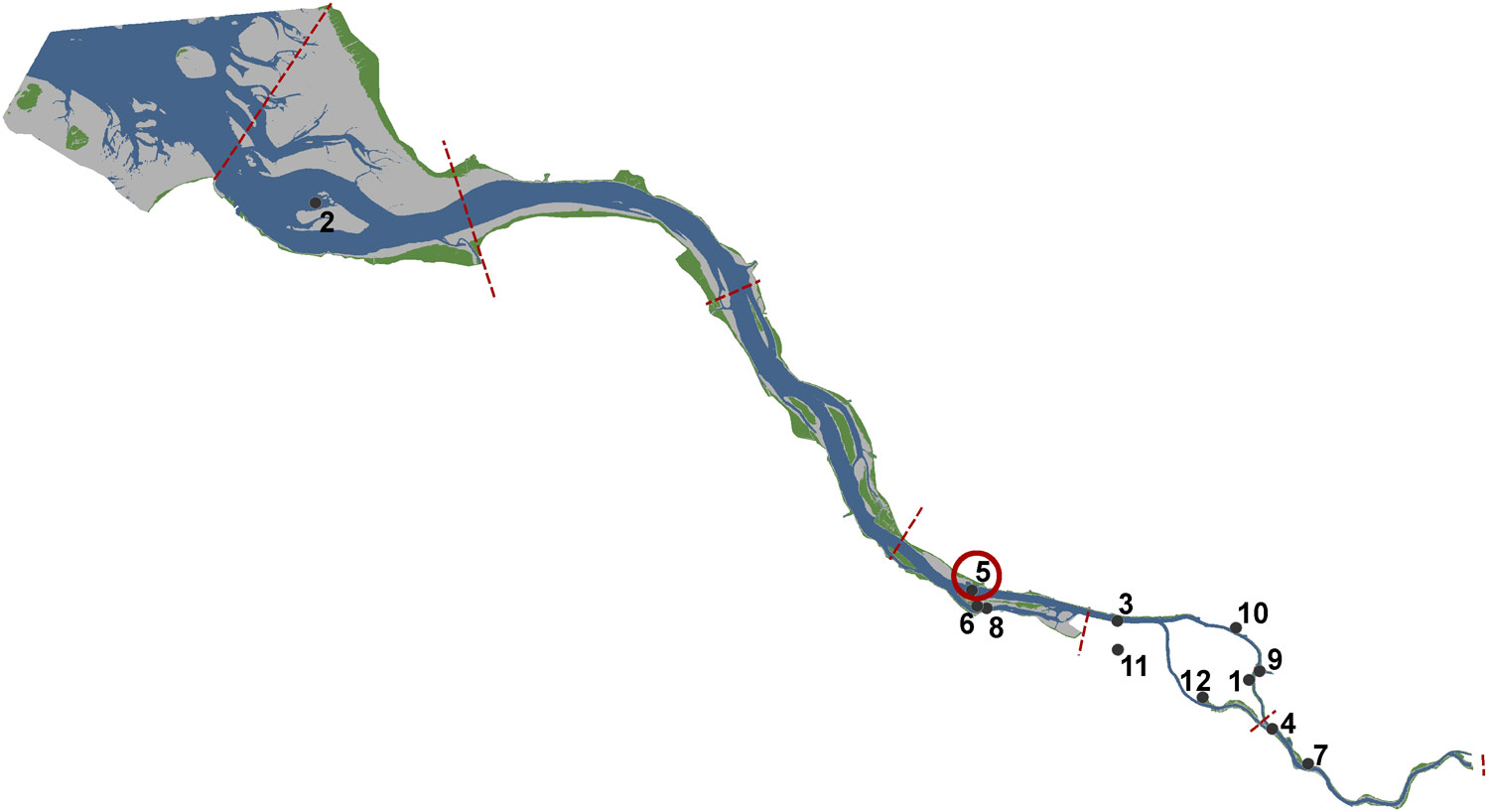 The “Sediment Trap near Wedel”, built in 2008 downstream of the City of Hamburg, consists of an approximately 2 km long and 2 meters deep sag. North Sea sediments, which are transported in the upstream direction by the flood current, should be caught before they reach the Port of Hamburg.