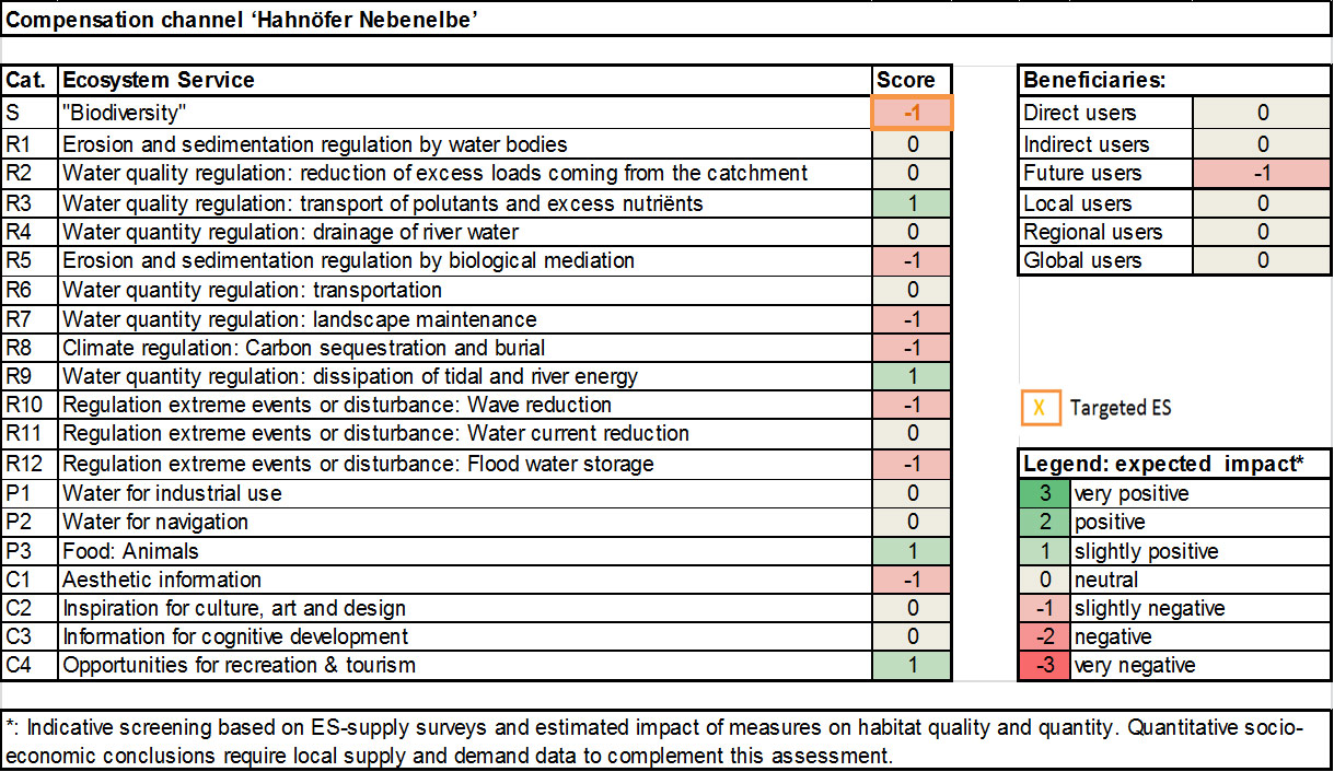 The screening of the ecosystem services (ESS) that were affected by the measure `Hahnöfer Nebenelbe` showed more negative than positive effects on the ESS that were generated by implementing this measure. This is caused by the transformation of mudflats, which already delivered a certain amount of ecosystem services, into shallow water area.