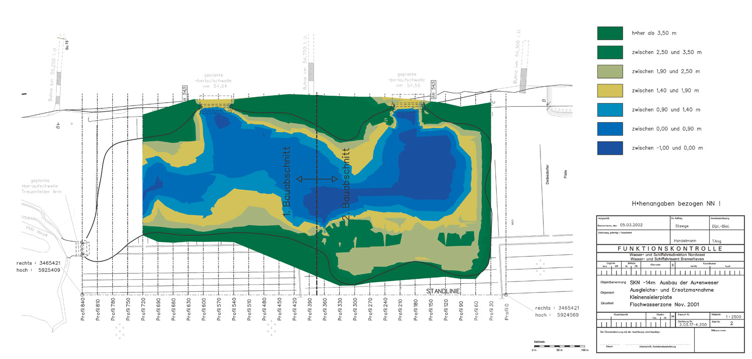 The measure ‘Shallow water zone Kleinensieler Plate’ was designed and implemented as a compensation measure after national environmental law for the outer Weser deepening (chart datum -14 m) which was executed in 1998 and 1999.