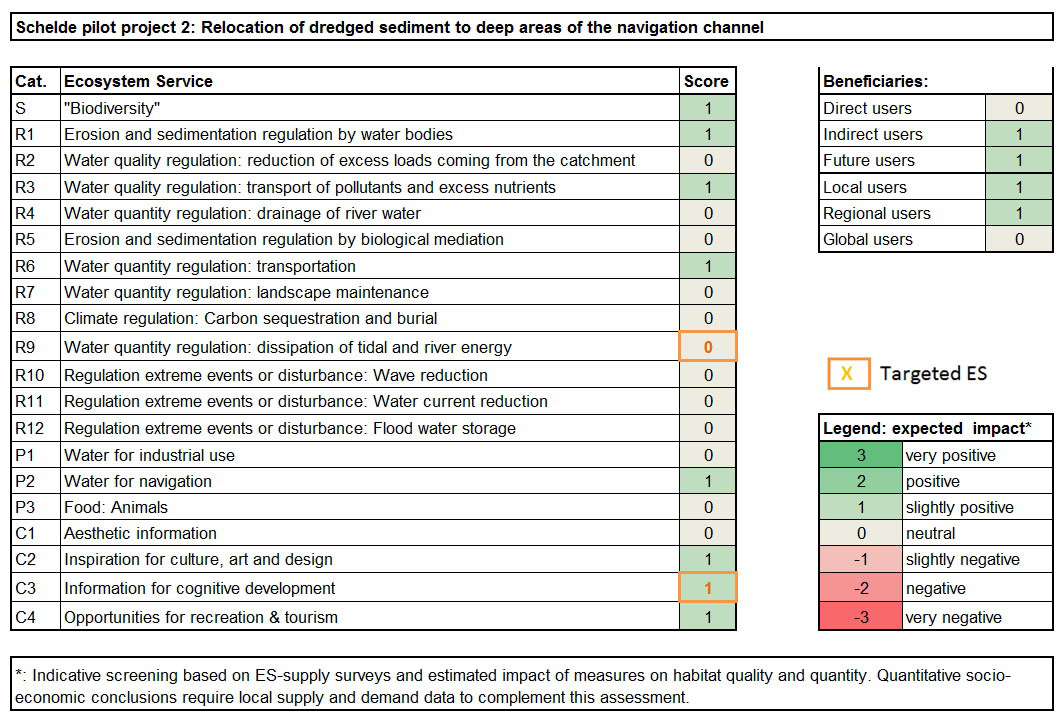Additionally, the results will be used for a larger project to fill up deeper areas of the navigation channel with the aim of creating current deflecting zones by which tidal energy is dissipated (ES ‘Water quantity regulation: dissipation of tidal and river energy’). The expected impact on this ES is nihil (neutral).