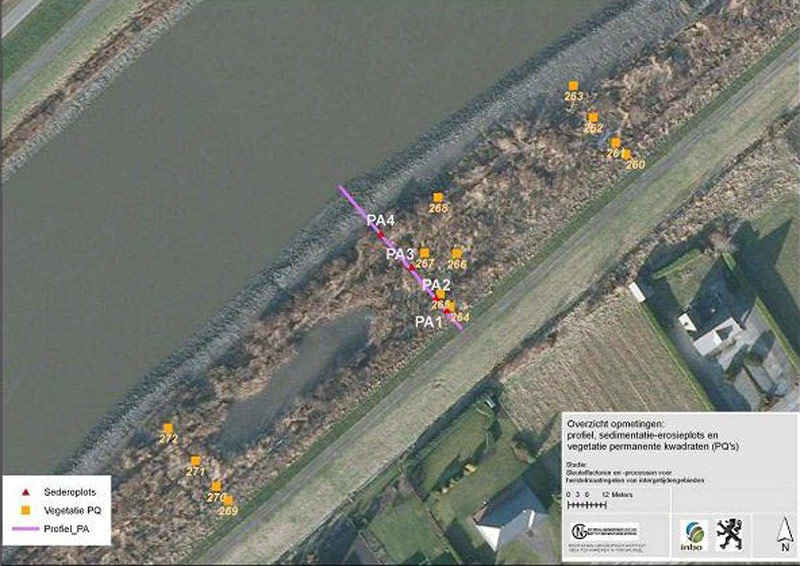 In the Paddebeek wetland there are four permanent sample locations at one transect perpendicular to the shoreline central in the area (Figure 2: red spots). All sample locations are on the restored site: PA1 and PA2 are on the high marsh terraces (at start of the monitoring resp. on 5.8 and 5.3mTAW), PA3 is at start on the new mudflat terrace (4.8mTAW) and PA4 is near the old dike (4.7mTAW) (Van den Neucker et al. 2007). Two extra transects are used with PQ’s to monitor vegetation (Figure 2: yellow spots).