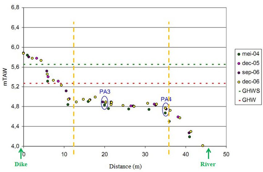 The central zone of the wetland (12-36m from the dike with plots PA3 and PA4) is flat with a river-oriented gradient of 0.5% and a gradual sedimentation rate of 4 to 6cm per year during the first monitoring period (Van den Neucker et al. 2007) and of approximately 2cm per year during the second monitoring period (Speybroeck et al. 2011).