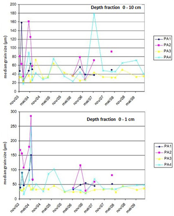Locations PA3 and PA4 are rich in silt content during the entire monitoring period with a median grain size, in both depth fractions, mainly smaller than 40 µm (PA3) and 50 µm (PA4) (Van den Neucker et al. 2007). From the end of 2005 at location PA3, the median grain size in the upper centimetre (0-1cm) was always a little smaller than in the deeper fraction (0-10cm) (Figure 4).