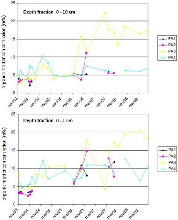 At locations PA1 and PA2, the organic matter concentration remained almost constant during the first year after the construction. At both locations, the concentration was low, always below 4% (Figure 5). In 2006, the concentration increased up to 5% in the deeper fraction (0-10cm). In the top fraction (0-1cm), the concentration increased even more but the variation was large (Van den Neucker et al. 2007).