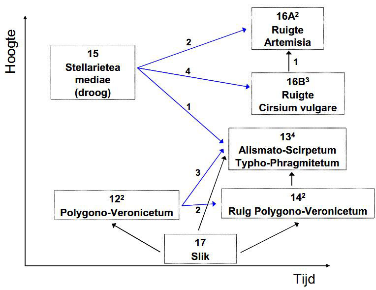 Based on the flood frequency and the appearance of different vegetation types on the Paddebeek wetland, two zones can be distinguished: the lower elevation zone (with a flood frequency between 81 and 92%) which is mainly colonized by vegetation types 12, 13 and 14, and the higher elevation zones (with a flood frequency between 23 and 33%) which is mainly colonized by vegetation types 15, 16A and 16B (Figure 6). At the lower elevation zone, pioneer vegetation type 12 (Polygono-Veronicetum anagallidis-aquaticae) first colonized bare mud (type 17 “slik”) and then evolves to type 13 (Alismato-Scirpetum/Typho-Phragmitetum) and type 14 (rough Polygono-Veronicetum) (Figure 7 & Figure 8). At the higher elevation zone with only few estuarine influences, dry pioneer vegetation type 15 (Stellarietea mediae) changed to roughness type 16B (rough Circium vulgare) and sometimes also type 16A (rough Artemisia).