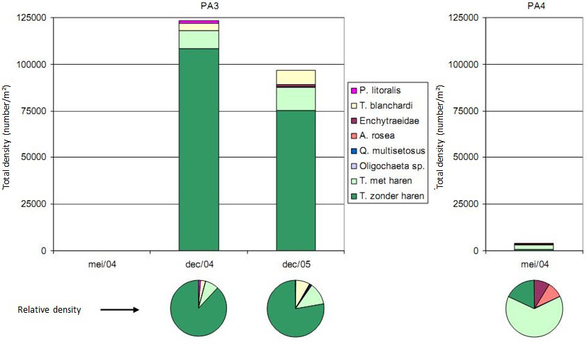 At location PA3 no Oligochaeta were found immediately after the construction (May 2004), but the density increased afterwards (almost 125,000 individuals/m² in December 2004 and almost 100,000 individuals/m² in December 2005), see Figure 10. Tubificiden without hair were always dominant (Van den Neucker et al. 2007). The tubificiden without hair were mostly juveniles from the Limnodrilus-species (L. claparèdeianus, L. hoffmeisteri en L. udekemianus) and Tubifex blanchardi. At location PA4 low Oligochaeta densities (less than 4,000 individuals/m²) were found immediately after the construction (May 2004), mainly tubificiden with hair (Figure 9). The tubificiden with hair were mostly juveniles from T. tubifex. After May 2004, Oligochaeta was not sampled anymore at location PA4.