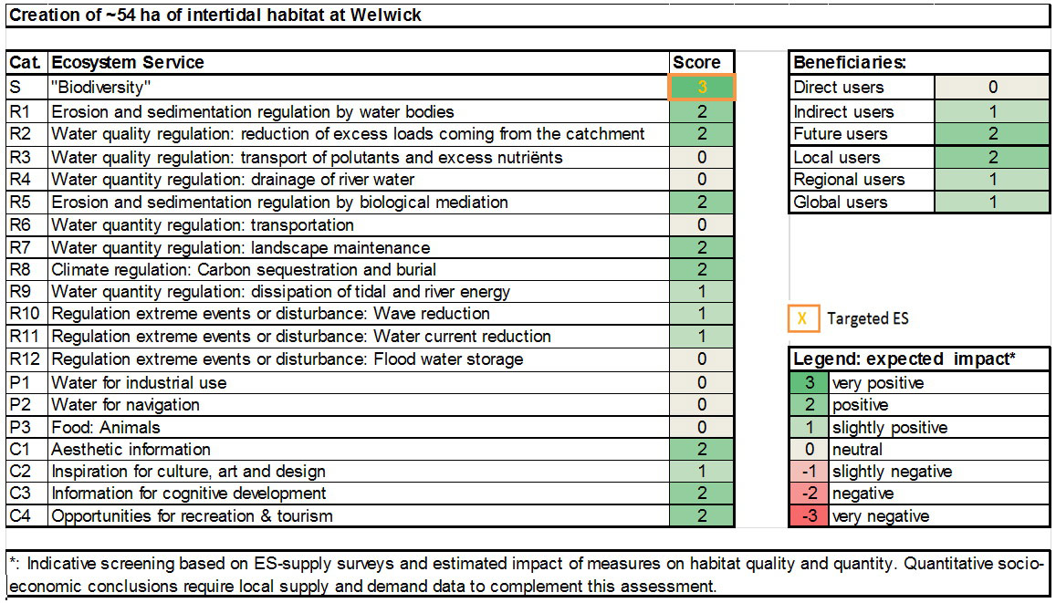 Table 5: Ecosystem service analysis for Welwick: Indication of habitat surface and quality change, i.e. situation before versus after measure implementation