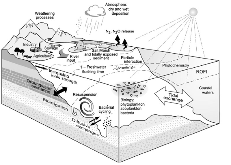 Riverine inputs are recognized as the world’s major source of macronutrients to the global oceans. However, macronutrients passing through estuaries are subjected to several biogeochemical transformations, both in the water column and by exchange with the sediment of the subtidal and intertidal area. Furthermore, there may be additional atmospheric or coastal inputs and overall strong physical control by hydro-morphology (residence time, light climate, suspended matter dynamics, freshwater discharge…) (Desmit et al. 2005, Statham et al. 2011). Groundwater input might be another, at present underestimated, source of input (Statham et al. 2011). Overall interactions within estuaries and the environment are presented in fig. 1.