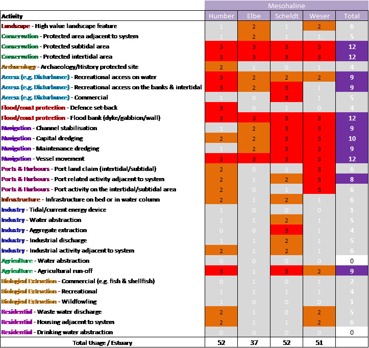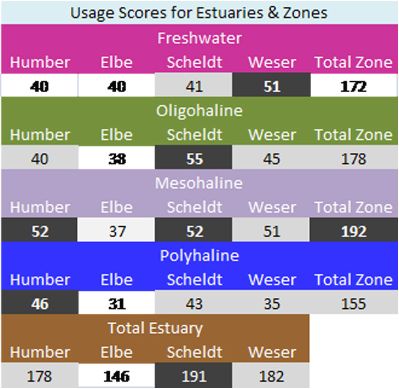 Based on the above, the mesohaline zone featured eight high scoring uses/issues in the Humber, with a total score for the zone of 52. For the Elbe, four high scoring uses/issues were identified, with a total score of 37. The Scheldt again featured 11 high scoring uses/issues giving a total score for the zone of 52, and the Weser featured 10 high scoring uses/issues with a total usage score of 51.