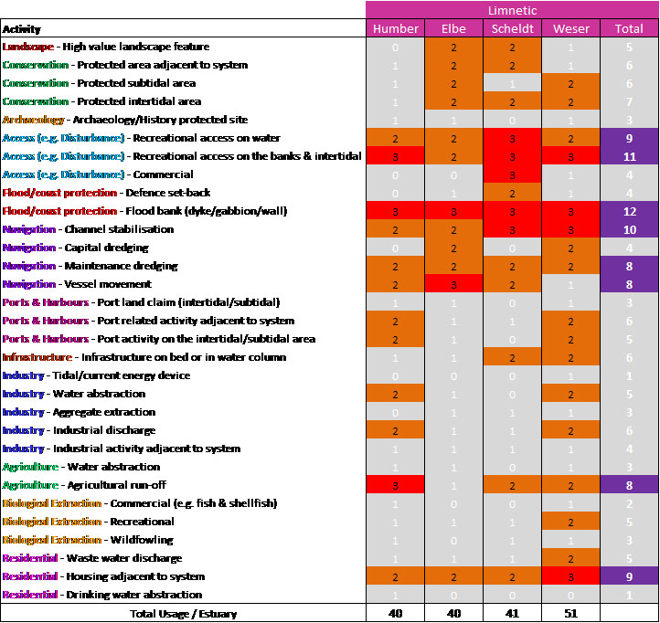 Based on the above, the limnetic zone featured three high scoring uses/issues in the Humber, with a total score for the zone of 40. For the Elbe, two high scoring uses/issues were identified, with a total score for that region of the estuary of 40, the same as the Humber. The Scheldt featured five high scoring uses/issues with again an overall score of 41 for the estuary zone being broadly comparable to those of the Humber and Elbe. However, whilst four high scoring uses/issues were identified, the overall score for the zone was considerably higher than the other estuaries (51).