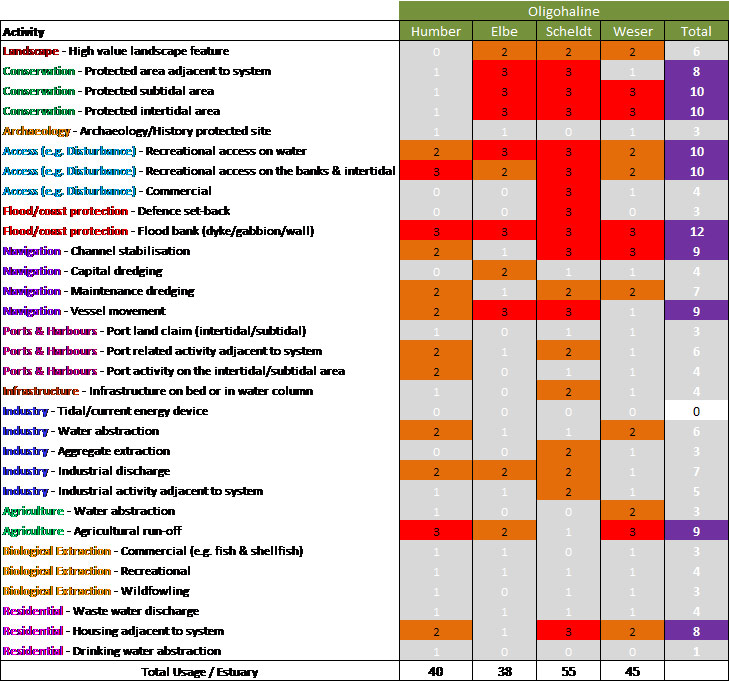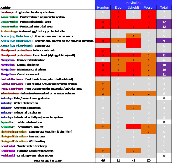 Based on the above, the polyhaline zone featured eight high scoring uses/issues in the Humber, with a total score for the zone of 46, whilst for the Elbe, six high scoring uses/issues were identified, with a total score of 31. The Scheldt featured nine high scoring uses/issues giving a total score for the zone of 43, and the Weser featured 4 high scoring uses/issues with a total usage score of 35.